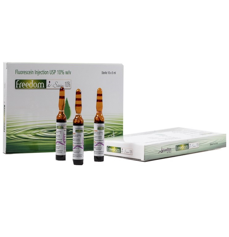 Caja con 10 ampolletas Fluoresceína Inyectable 10% w/v “Freedom” Ampolleta de 5 ml